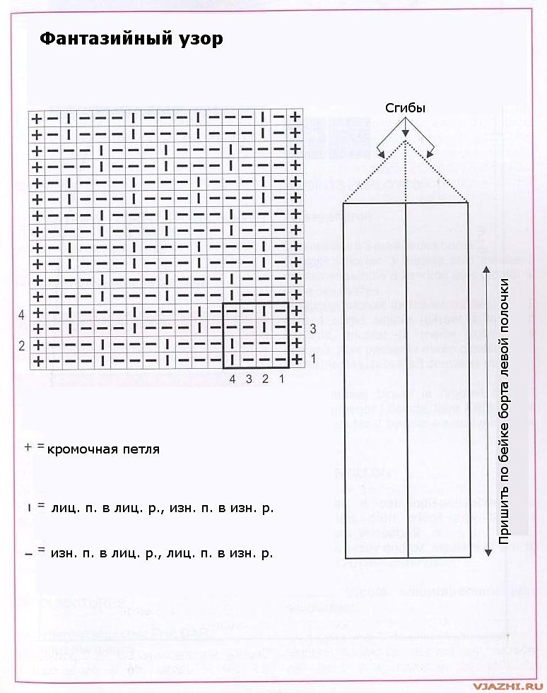 Перед: Вязать так же как спинку, но на высоте 45 см, от проймы рукава вязать следующим образом: 3 п. закрыть, 52 п. косами, 16 п. резинкой. 8 п. планка, 1 кром. набрать скрещенной из протяжки между петлями предыдущего ряда = левая половинка. Остальные петли - правая половинка перевести на вспом. спицу и отложить. В планке лев. половинки вывязать 3 петли для пуговиц (= 5-З петли от кром. закрыть, в следующем ряду петли набрать). 1-я петля расположена на высоте 2 см от низа планки, следующие петли на расстоянии 6 см друг от друга. Одновременно для расширения резинки 16 раз в каждом 4-м р. 2-ю и 3-ю п. перед резинкой провязать вместе лиц. После последней петли косы набрать 1 п. скрещенной из протяжки между петлями предыдущего ряда, вставить в рисунок резинки. На высоте 61 см для выреза горловины с левого края отложить на вспом. спицу 11 п., в каждом 2-м р. закрыть 1 раз 5 п., 1 раз 3 п., 1 раз 2 п., 8 раз по 1 п. Левую половинку вязать симметрично правой, но без петель для пуговиц, при этом 9 п. планки набрать из внутреннего ряда планки правой половинки.