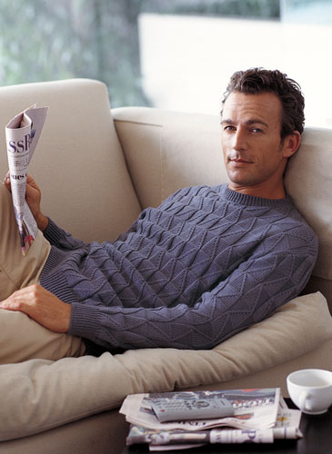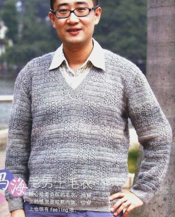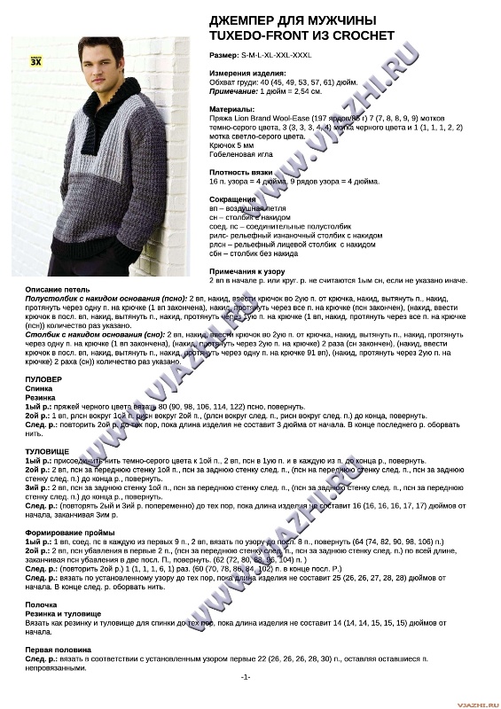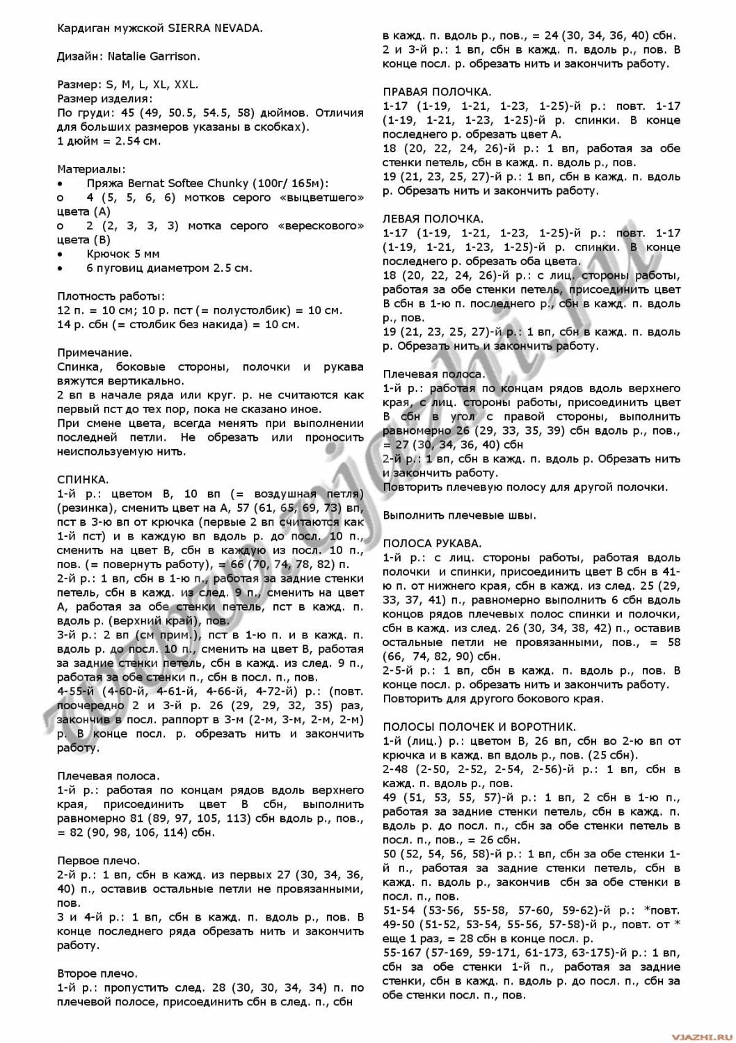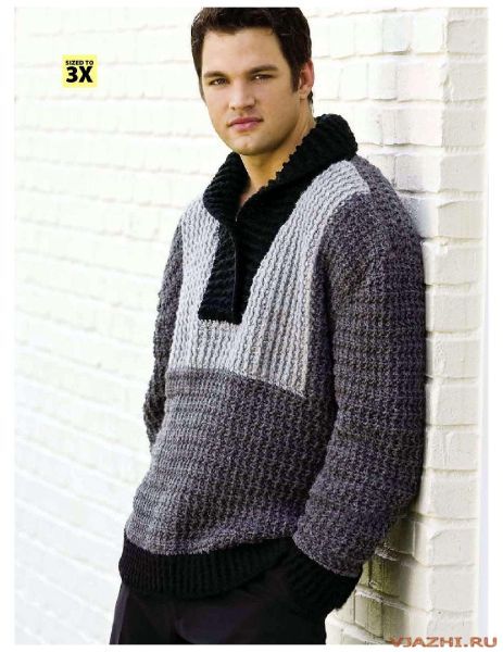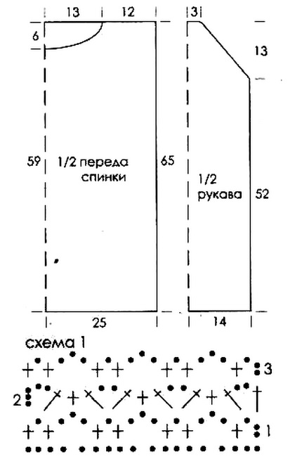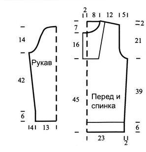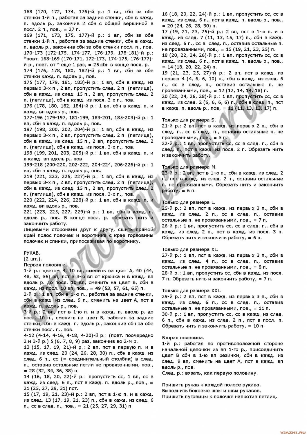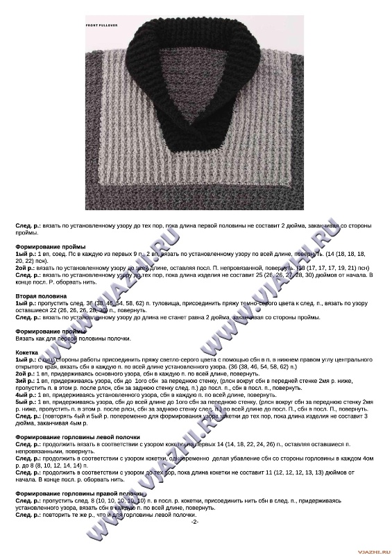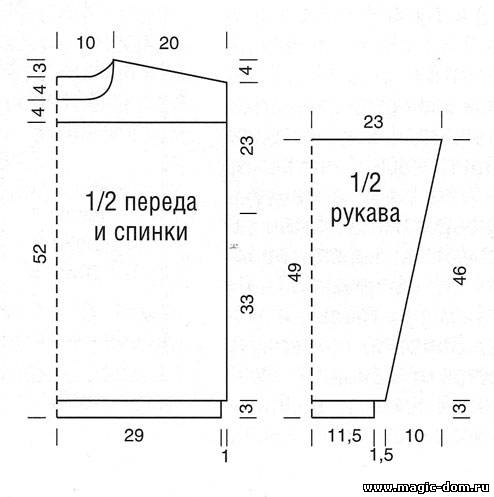 Спинка: На спицы № 3 набрать 126 п., вязать резинкой 6 см. при этом в последнем (изн.) р. равномерно прибавить 12 п. = 138 п. Дальше вяэать спицами № 4 косами: кром.. повторить рапп. 8 раз. 3 п. после рапп.. кром. Для боковых скосов с обеих сторон в 22 р .прибавить по 1 п., 5 раз по 1 п. в каждом 16-м р., прибавленные петли вставить в рисунок = 150 п. На высоте 45 см для проймы рукавов с обеих сторон закрыть 1 раз по 3 п., 3 раза по 2 п.. 5 раз по 1 п. в каждом 2-м с обеих сторон закрыть 3 раза по 9 п., 1 раз по 10 п. е каждом 2-м р. Оставшиеся 48 п. закрыть.