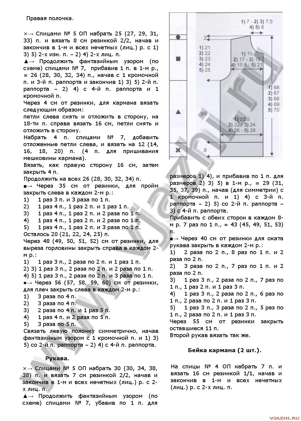 Рукав: На спицы № 3 набрать 70 п., вязать резинкой 6 см, при этом в последнем (изн.) ряду равномерно прибавить 4 п. = 74 п. Дальше вязать спицами № 4 косами: кром., 4 раза рапп., 8 п. после рапп.. кром. Для скосов рукава с обеих сторон прибавить 12 раз по 1 п. в каждом 10-м р. (прибавленные петли вставить в рисунок) = 98 п. На высоте 43 см для оката рукава с обеих сторон закрыть 2 раза по 3 п., 5 раз по 2 п., 7 раз по 1 п., 5 раз по 2 п., 2 раза по 3 п. в каждом 2-м р. Оставшиеся петли закрыть.