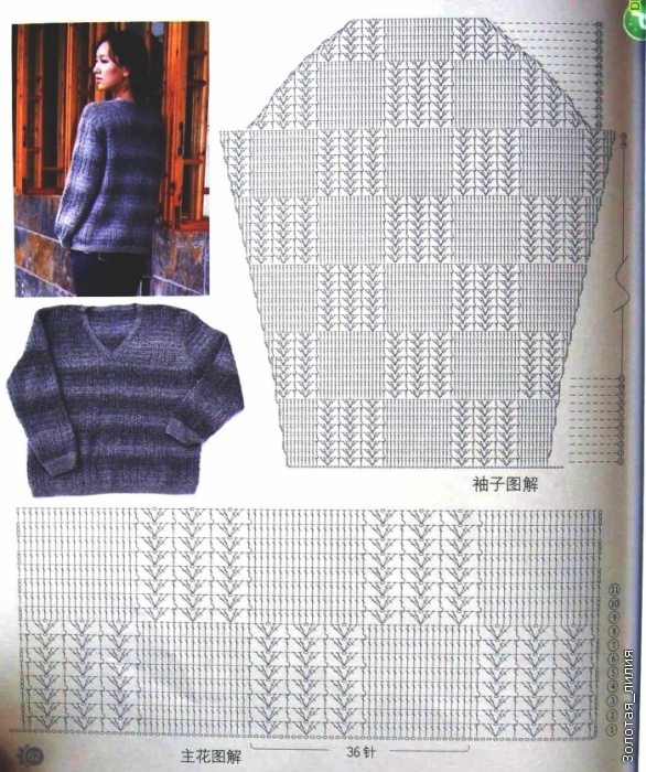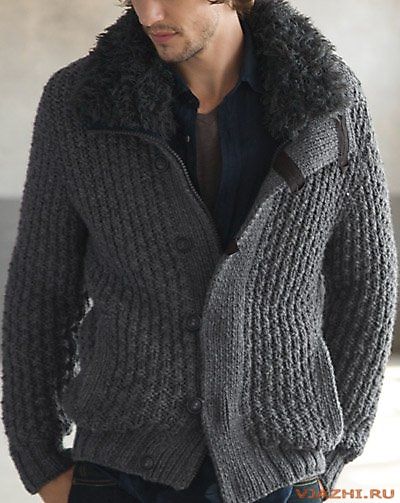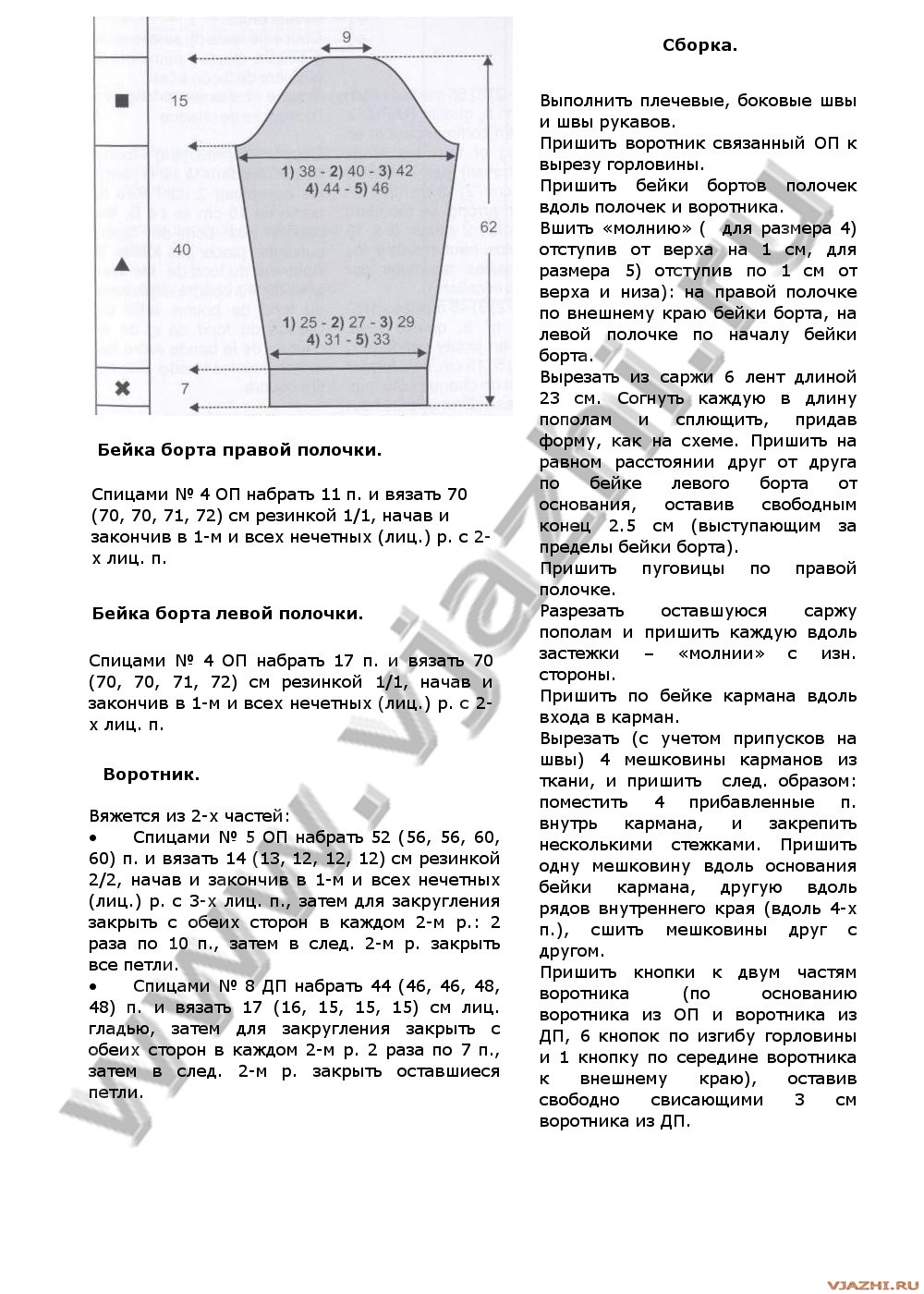 Сборка: Выполнить плечевые, боковые швы и швы рукавов. На круговые спицы из края выреза горловины набрать 82 п. Отложенные п. передних планок перевести на круговые спицы по краям. Вязать п. ппанок по рисунку, остальные п. резинкой. На высоте 10 см. все петли закрыть. На правой планке пришить пуговицы соответственно петлям.