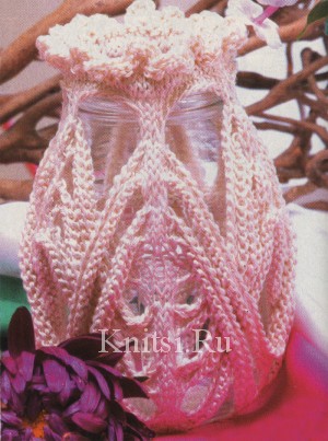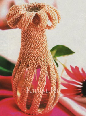 Сшейте участки начального и конечного рядов в 7, 16, 4 п. Через разрез вставьте бутылку - участком в 7 петель к донышку. С другого конца участок полотна с разрезами отогните на лицевую сторону. Оформите таким образом верхнюю часть вазы.