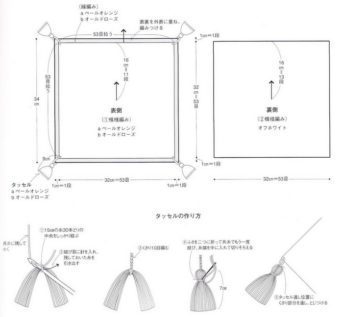 Рисунок: платочная вязка (все петли - лицевые) поворотными рядами в поперечном направлении. Плотность вязания - 27 п.х53 р.= 10х10 см.