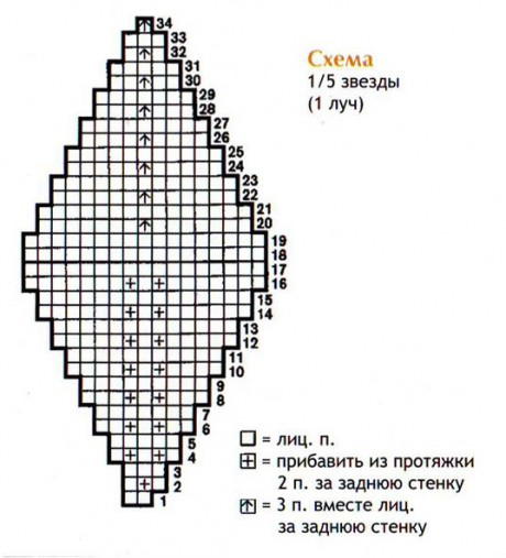 1 ряд — *1 лиц. *; 2 ряд - *1 лиц., 1 нак., 1 лиц., 1 нак., 1 лиц.*; 3 ряд - *1 лиц.*; 4 ряд - *1 лиц., 1 нак., 3 лиц., 1 нак., 1 лиц.*; 5 ряд - * 1 лиц.*; 6 ряд - *1 лиц., 1 нак., 1 лиц., 1 нак., 3 лиц., 1 нак., 1 лиц., 1 нак., 1 лиц.*; 7-8 ряд - *1 лиц.*; 9 ряд - *3 лиц., 2 закрыть, 3 лиц. переснять на булавку 1, 3 закр.*; 10 ряд — *3 лиц., 51 нак.*; 11-15 ряд - * 1 лиц.*; 16 ряд - *3 лиц., 24 закр., 3 лиц., 24 закр.*; 17 ряд - *3 лиц., 51 нак.*; 18-22 ряд - * 1 лиц.*; 23 ряд - *3 лиц., 24 закр., 3 лиц., 24 закр.*; 24 ряд - *3 лиц., 51 нак.*; 25-29 ряд - * 1 лиц.*; 30 ряд - *3 лиц., 24 закр., 3 лиц. переснять на булавку 2, 24 закр.*; 31 ряд - *3 лиц., 24 нак., 3 лиц. с булавки 1, 24 нак.*; 32-36 ряд - * 1 лиц.*; 37 ряд - *3 лиц., 24 закр., 3 лиц., 24 закр.*; 38 ряд - *3 лиц., 24 нак., 3 лиц., 24 нак.*; 39-43 ряд - * 1 лиц.*; 44 ряд - *3 лиц., 24 закр., 3 лиц., 24 закр.*; 45 ряд - *3 лиц., 24 нак., 3 лиц., 24 нак.*; 46-50 ряд - * 1 лиц.*; 51 ряд - *3 лиц., 51 закр.*; 52 ряд - *3 лиц., 5 нак., 3 лиц. с булавки 2, 5 нак.*; 53-55 ряд - * 1 лиц.*; 56-61 ряд - * 1 лиц., 1 изн.*; 62 ряд - * из 1 - 5 петель, 1 лиц.*; 63 ряд - * 1 изн.*; 64 ряд - петли закрыть.