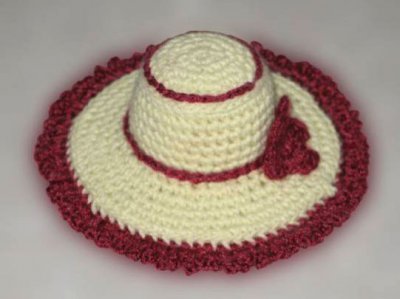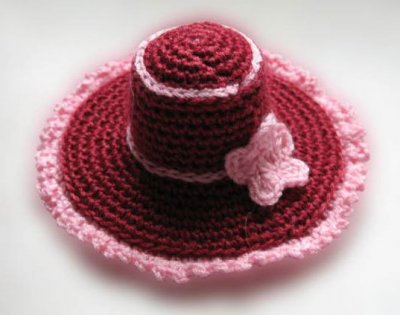 5. Далее вяжем большой плоский круг. Диаметр этого круга равен диаметру шляпки – то есть 9-11 см. Хорошенько набиваем тулью шляпки старыми нитками, синтепоном или поролоном.