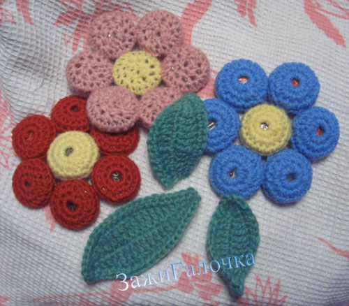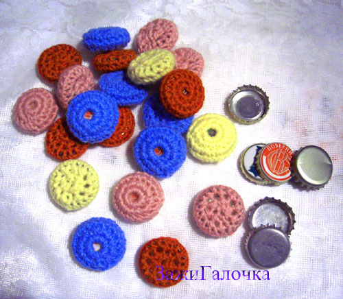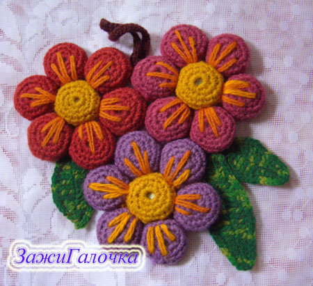 Для изготовления декоративной подставки понадобятся крышки от пивных бутылок и остатки шерстяных ниток, а также крючок 2,5мм и немного терпения. Обвяжите 3 крышки жёлтыми нитями и по 6 крышек тремя цветами, например, розовым, красным, голубым. Сшейте обвязанные крышки с нижней стороны в виде цветов, сшейте их между собой, как на фото, вышейте оранжевыми или жёлтыми нитями прожилки. Свяжите зелёными нитями 3 листочка и пришейте их к подставке. Сделайте петельку из шнура или свяжите её коричневыми нитями.