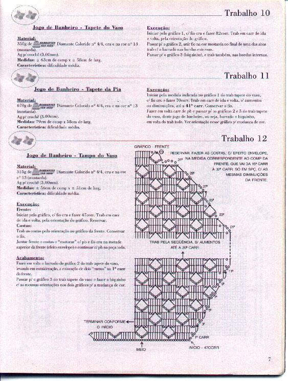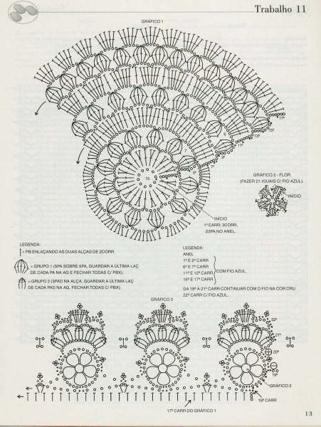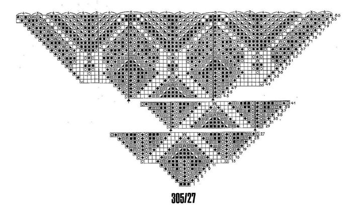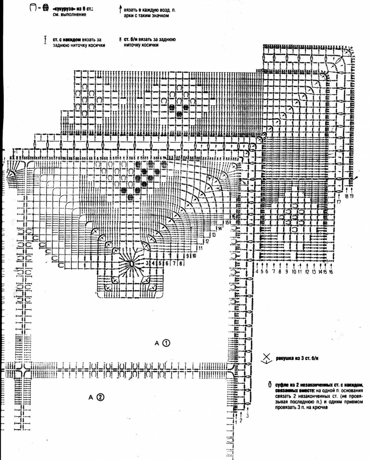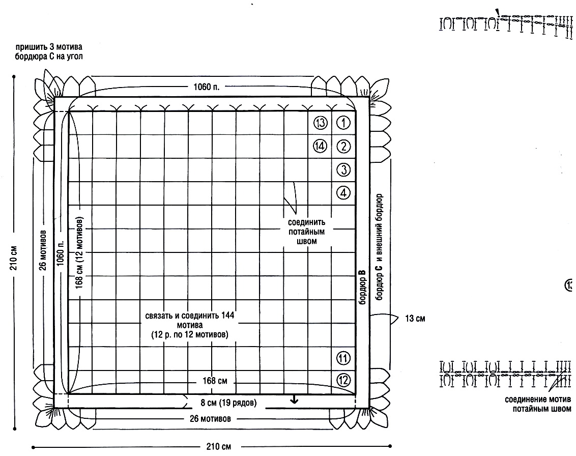 Бордюр В: вокруг собранных мотивов А провязать 19 рядов, замыкая соед. ст. Для 1 ряда связать 1060 ст. б/н по каждой стороне, получив 12 групп по 88 или 89 п. для мотива по схеме. С 6 по 14 ряд получится 29 ромбов. После 19 круга нить обрезать.