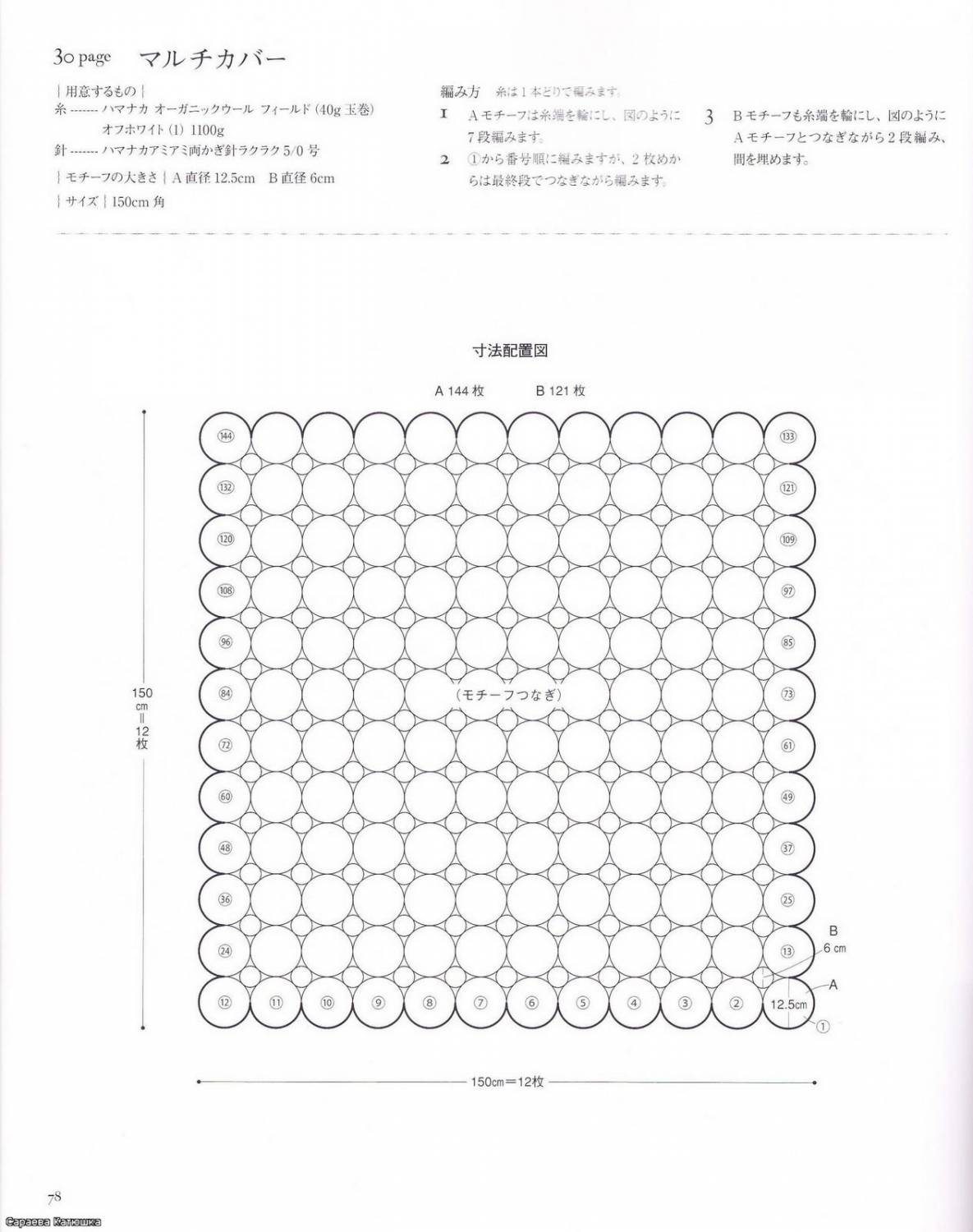 Мотив А: связать отдельно 144 мотива А, выполняя 16 рядов по спирали (не замыкая ряды). Для «кукурузы» выполнять 6 ст. с накидом в арку из 2-х возд. п. или ст. б/н предыдущего ряда, оттянуть п. на крючке, вывести крючок и ввести с лиц. стороны на изнаночную под обе ниточки косичкив первого из 6 ст., взять на крючок длинную п., сделать накид и протянуть рабочую нить через 2 п. Сборка мотивов: сложить мотивы лиц. сторонами и сшить потайным швом.