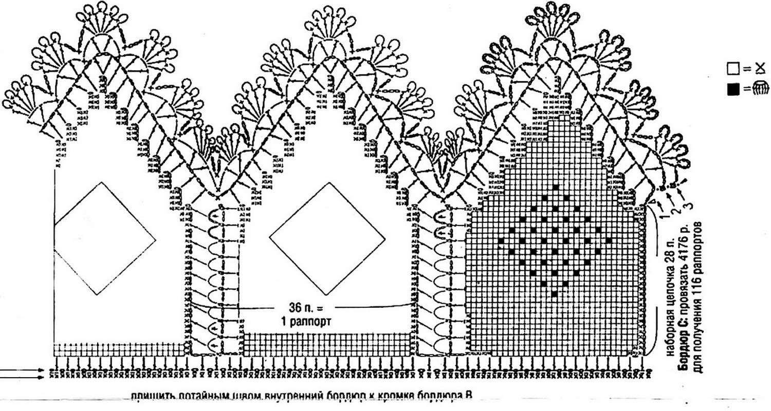 Бордюр С: начать с цепочки из 28 возд. п. и провязать 4176 р., 116 раз повторив 36 р. Сшить последний р. с наборной цепочкой. Затем по кругу связать внутренний и внешний бордюры. Для внутреннего бордюра выполнить 26 раппортов по каждой стороне по схеме.