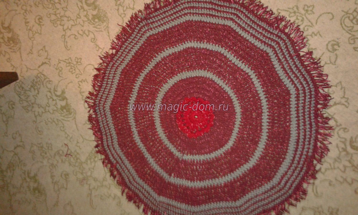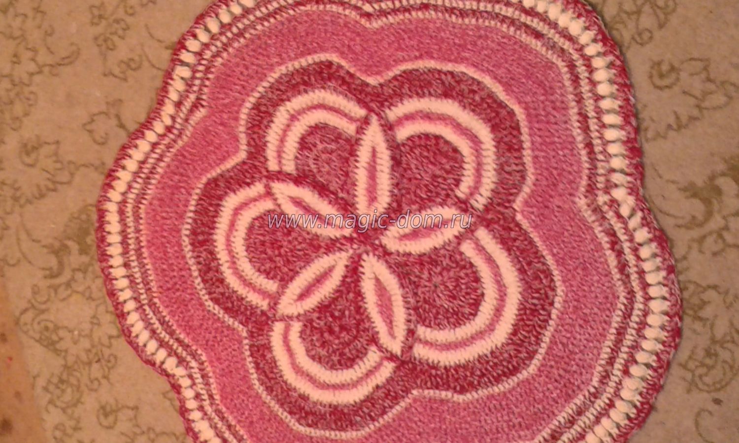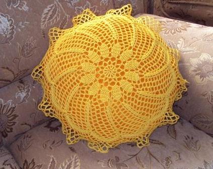Обычная круглая диванная подушка, украшенная большой салфеткой с узором цветка из яркой солнечной пряжи, осветит ваш дом и создаст радостное настроение. Свяжите для дома небольшое солнышко! Диаметр 55 см. Материалы: пряжа х/б 150 гр (110м/50г) яркого желтого цвета, крючок №3,5 , подушка диаметром 50 см с ярко-оранжевой наволочкой. Для украшения подушки вяжем большую салфетку по схеме, создавая узор крупного цветка из выпуклых рельефных столбиков. Готовую салфетку стираем, сушим, гладим и равномерно натягиваем на подушку закрепляя иголочками. Салфетку пришиваем к верхней наволочке в местах окончания лепестков крупного цветка из рельефных столбиков и по вершинам крайнего узора.