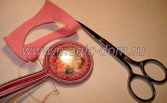 | Начинаю вшивать бусины жемчуга,обращайте внимание -как ложатся бусинки, всё должно быть симетрично.Все работы по прошиванию,должны быть с изнанки. при пришивании бусин ,прошивается весь приклеенный сутаж и фетр. при пришивании,обращайте внимание ,что иголка протыкает сутаж ровно в середину. сутаж должен плотно обхватывать бусины,ложится сутаж паралельно друг другу. при пришивании пальчиками ровняйте сутаж-постоянно! Тогда будет ровно и красиво! прежде,чем шить на дорогом материале потренируйтесь на более простом материале.На фото видно каждая деталь работы. обратите внимание,что сутажные ленты ложатся друг на друга паралельно и так пришиваются,это даёт гармонию и красоту. все работы ведутся с изнанки ,швы видны только с изнанки! кончики сутажа сначала проклеила и приклеила,а потом ещё и пришила.