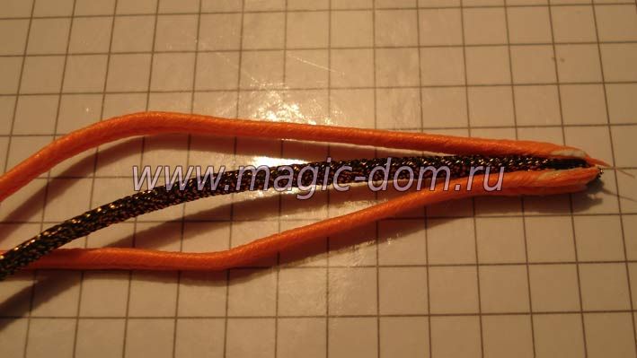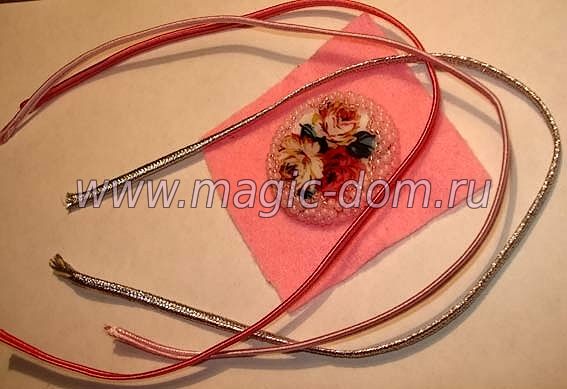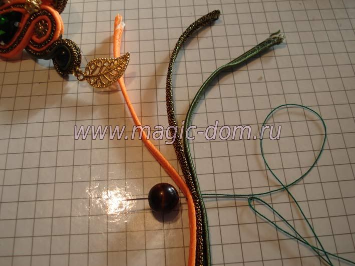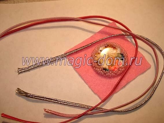 | Здесь у меня плоская бусина со сквозным отверстием.(25мм) Я еёприклеила и пришила,затем оплела бисером,хотя то,что можно пришить можно не оплетать бисером и так не выпадут из сутажа. отрезала 3 кусочка сутажа,около 30см.кончики сутажа проклеивать. затем приклеила первый сутаж,сразу убирать тряпочкой выступивший клей. также приклеила остальные сутажи.