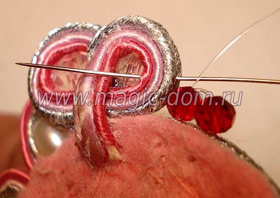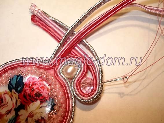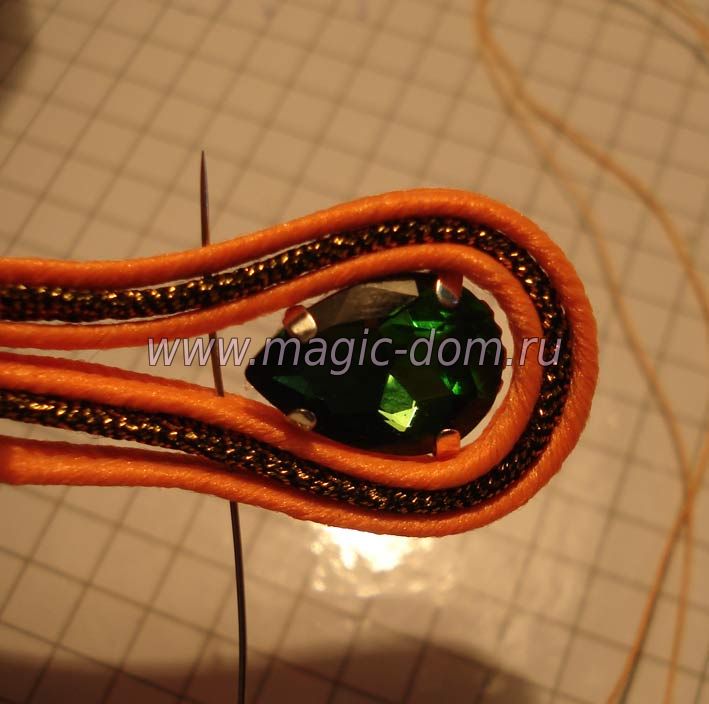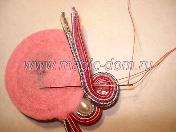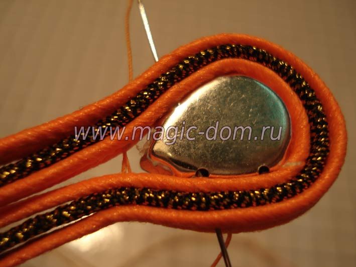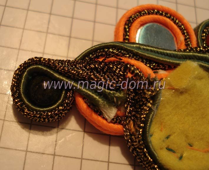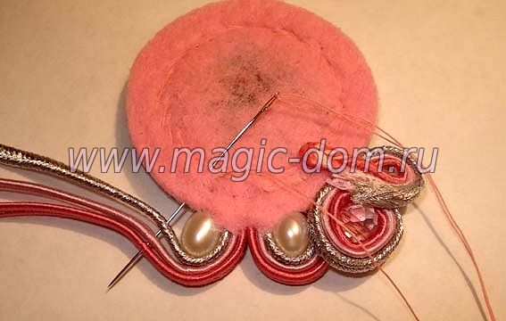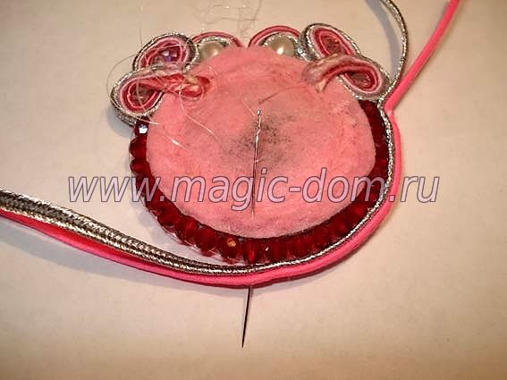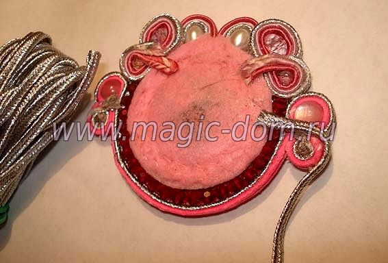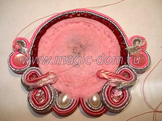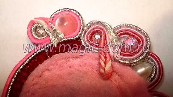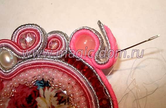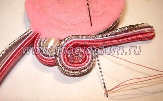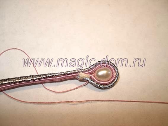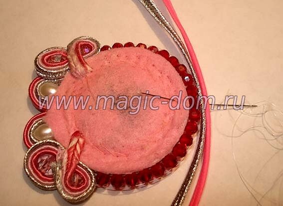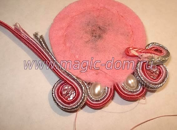 | В этом месте снова пришить сутаж. далее обшивается полукруг . сутаж пришит к сутажу и вшивается бусина 6мм. заворот сутажа.