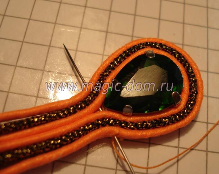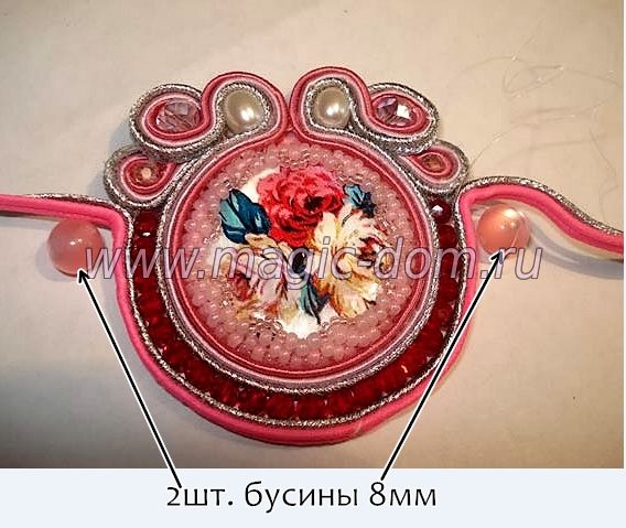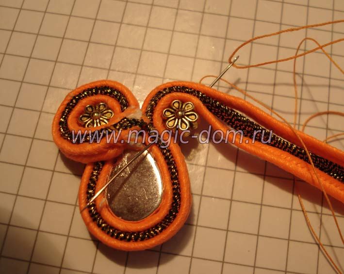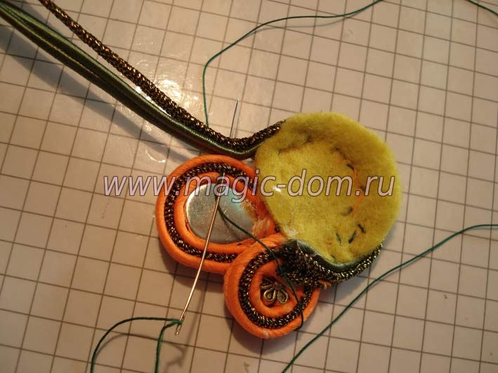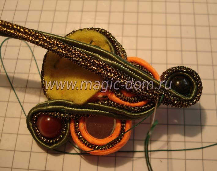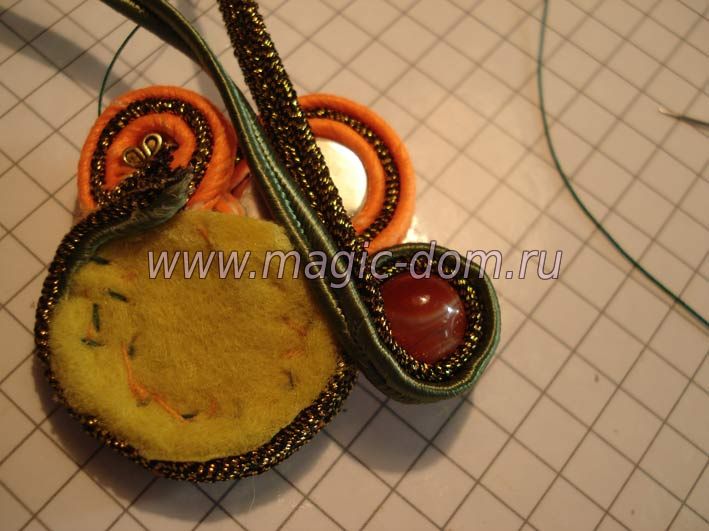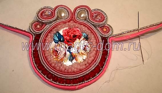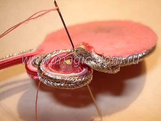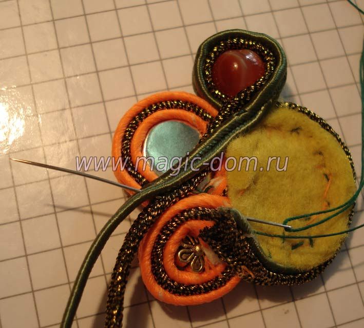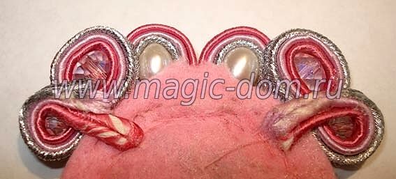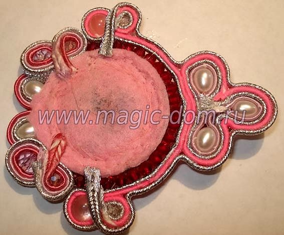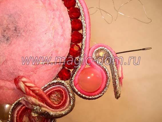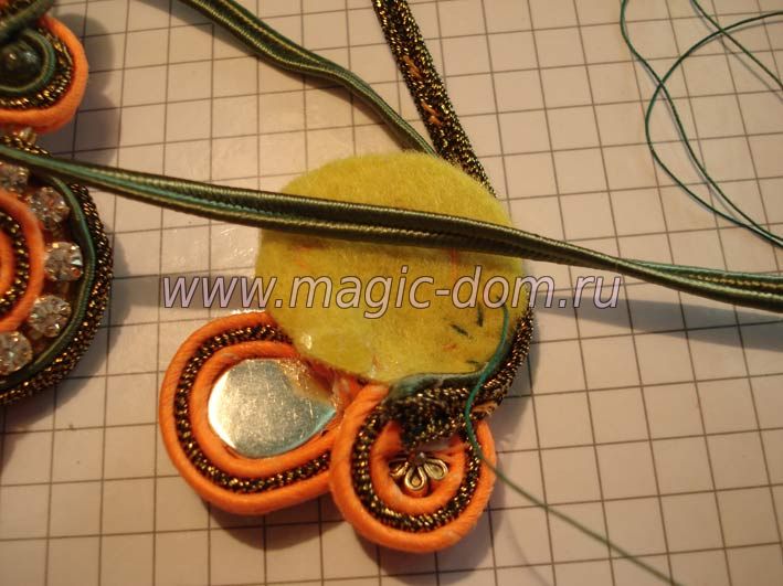 | В этом месте снова пришить сутаж. далее обшивается полукруг . сутаж пришит к сутажу и вшивается бусина 6мм. заворот сутажа.