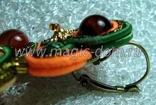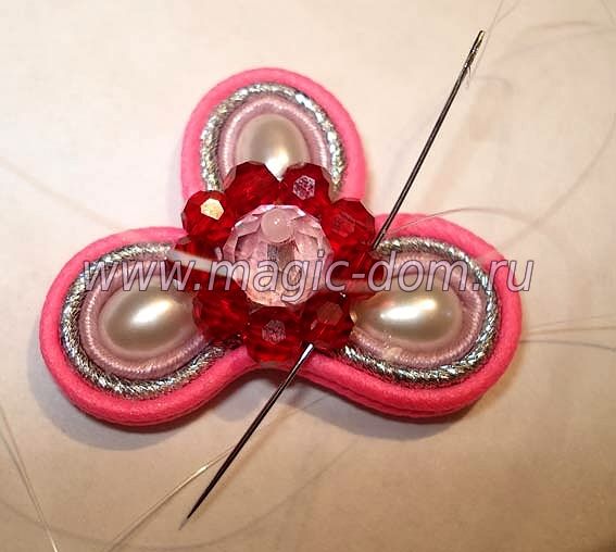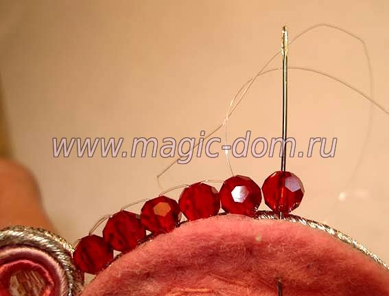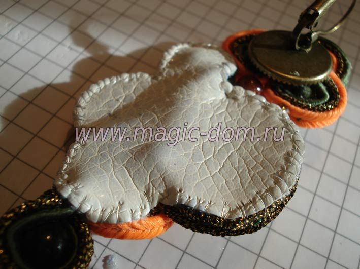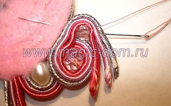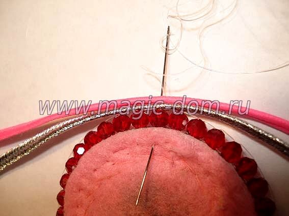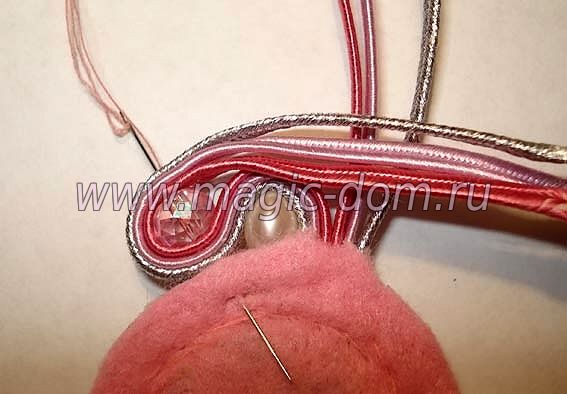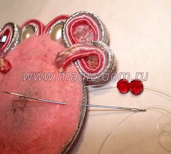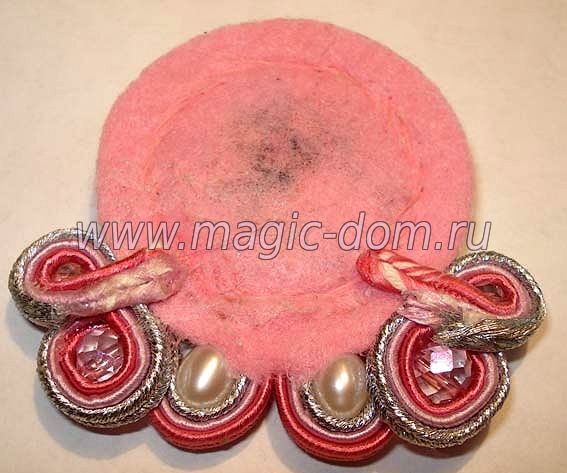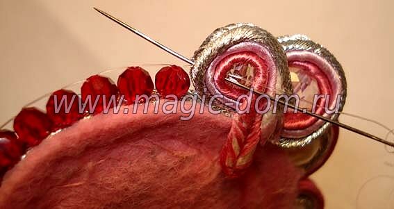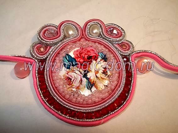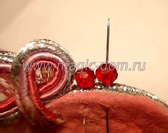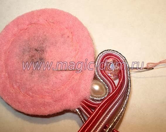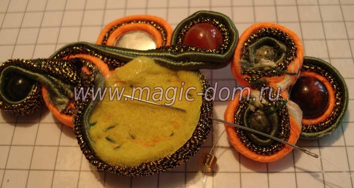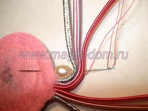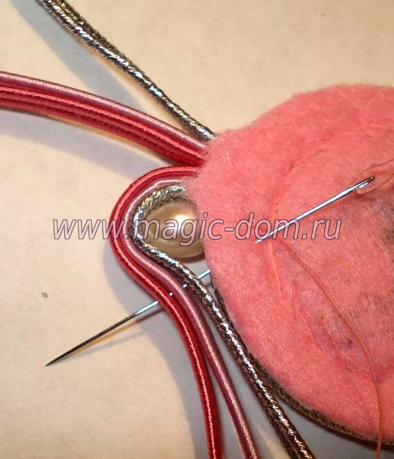 | В этом месте снова пришить сутаж. далее обшивается полукруг . сутаж пришит к сутажу и вшивается бусина 6мм. заворот сутажа.