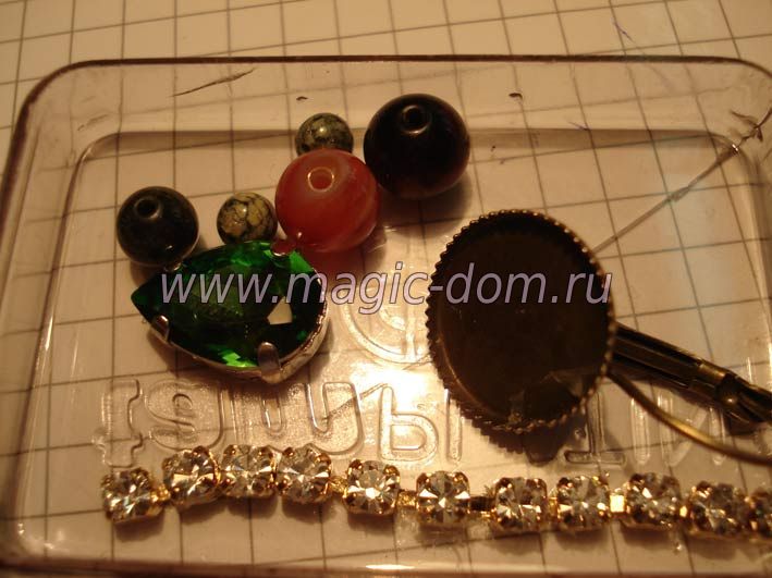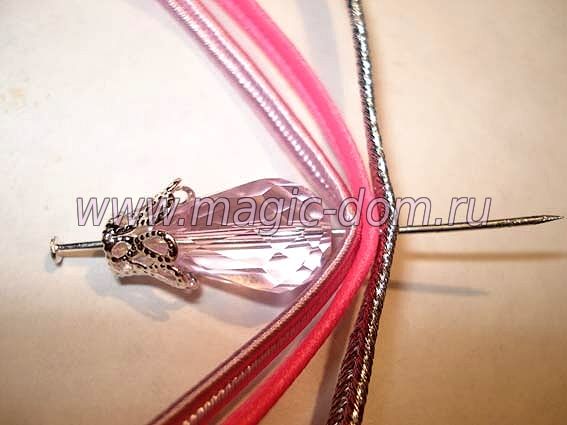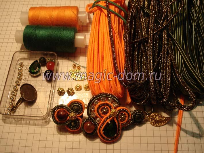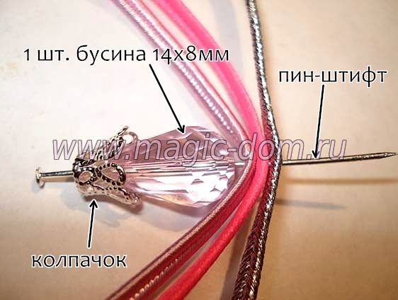 | Начинаем: чтобы узнать ск. вам надо длинны сутажа,оберните страз и 2 бусины по бокам,и заверните сутаж назад,это будет длинна сутажа для этой детали.
