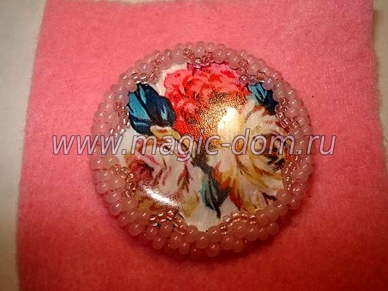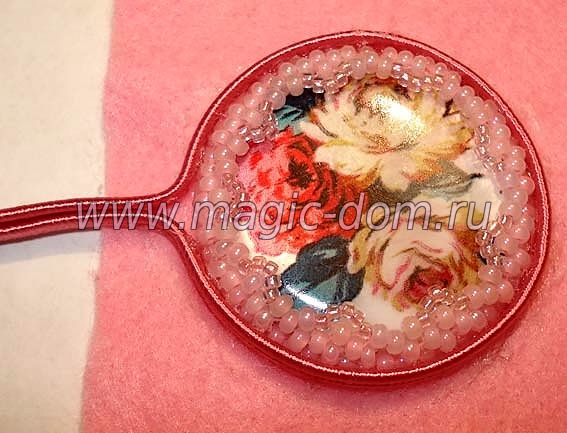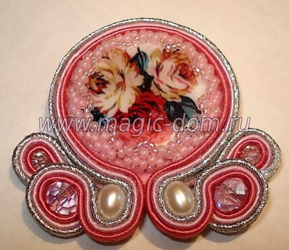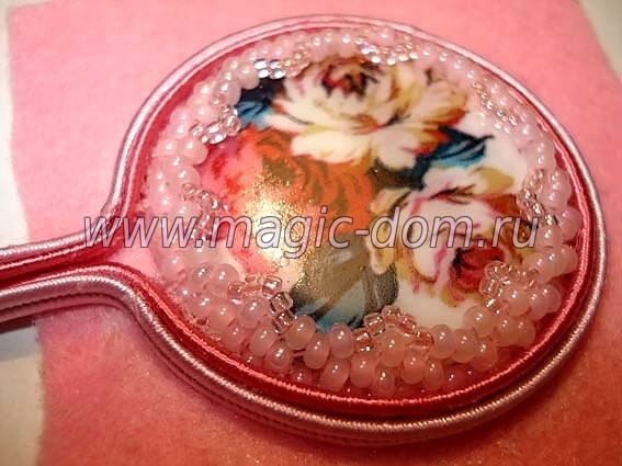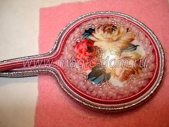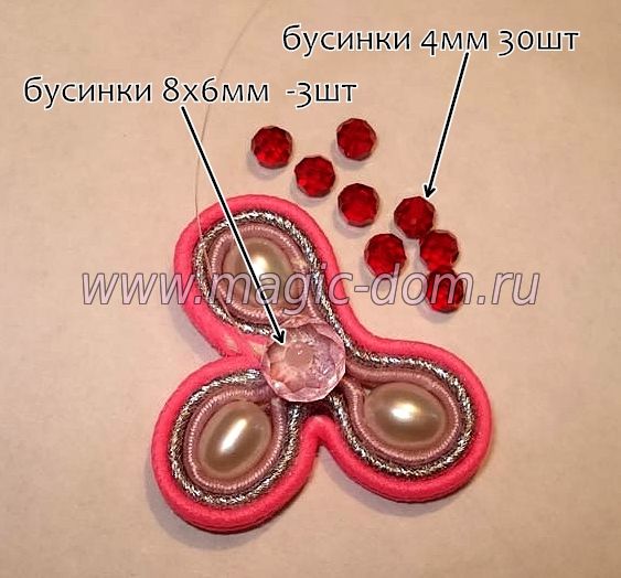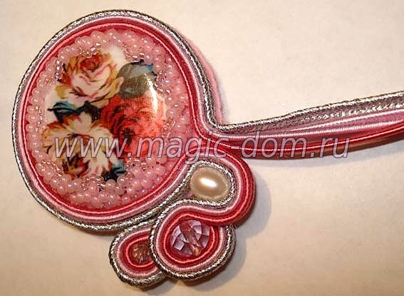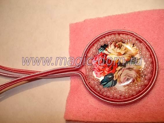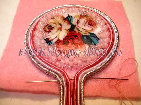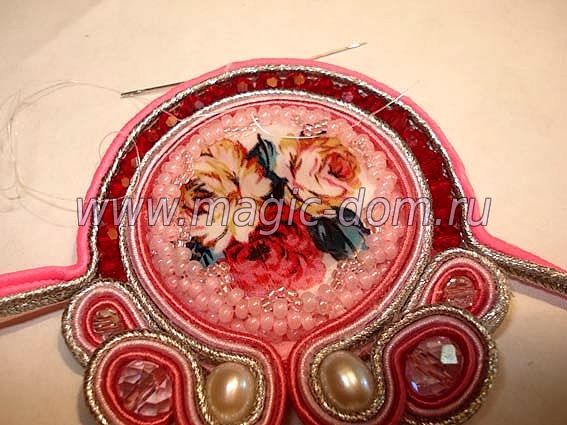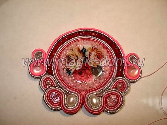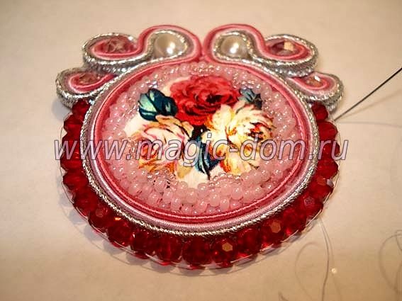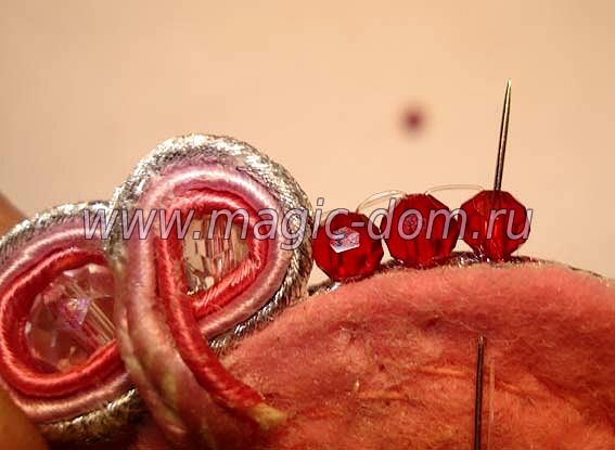 теперь надо обшить низ кулона бусинками 4мм. Эта техника называется кирпичное плетение (я училась по книге Дианы Фицжеральд) сначала надо пришить все бусинки ,как показано на фото, а потом пришивать сутаж,так будет ровно и красиво.