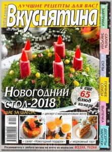 Кулинарный журнал, в котором каждый найдет для себя интересные рецепты: закуски и салаты, супы и горячее, блюда из мяса и рыбы, разнообразных овощей и грибов, соусы, напитки, торты и десерты - все, что нужно для вкусного обеда, завтрака или ужина, на каждый день или для праздничного стола, а также полезные советы, тонкости и хитрости кулинарного мастерства. Тема выпуска: Новогодний стол - 2018.