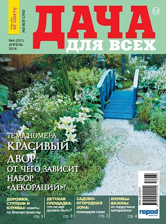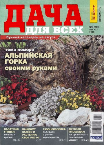 "Дача для всех" - это универсальный помощник всем садоводам и огородникам. В каждом номере: наиболее интересные советы читателей, мнение экспертов и рекомендации специалистов по благоустройству садового участка. На страницах журнала можно найти полезную информацию о выращивании фруктов и овощей, рекомендации по сезонным работам на приусадебном участке, кулинарные рецепты, советы читателей по лечению самых разных недугов и многое другое. Тема нового выпуска: Альпийская горка своими руками.