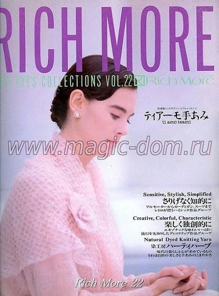 Популярный японский журнал по вязанию спицами и крючком красивых и элегантных женских моделей для всех времен года. Ажурные накидки, шали, болеро, кофточки, костюмы, кардиганы. Праздничные модели и на каждый день. К каждой модели даны выкройки. Знание языка не требуется.